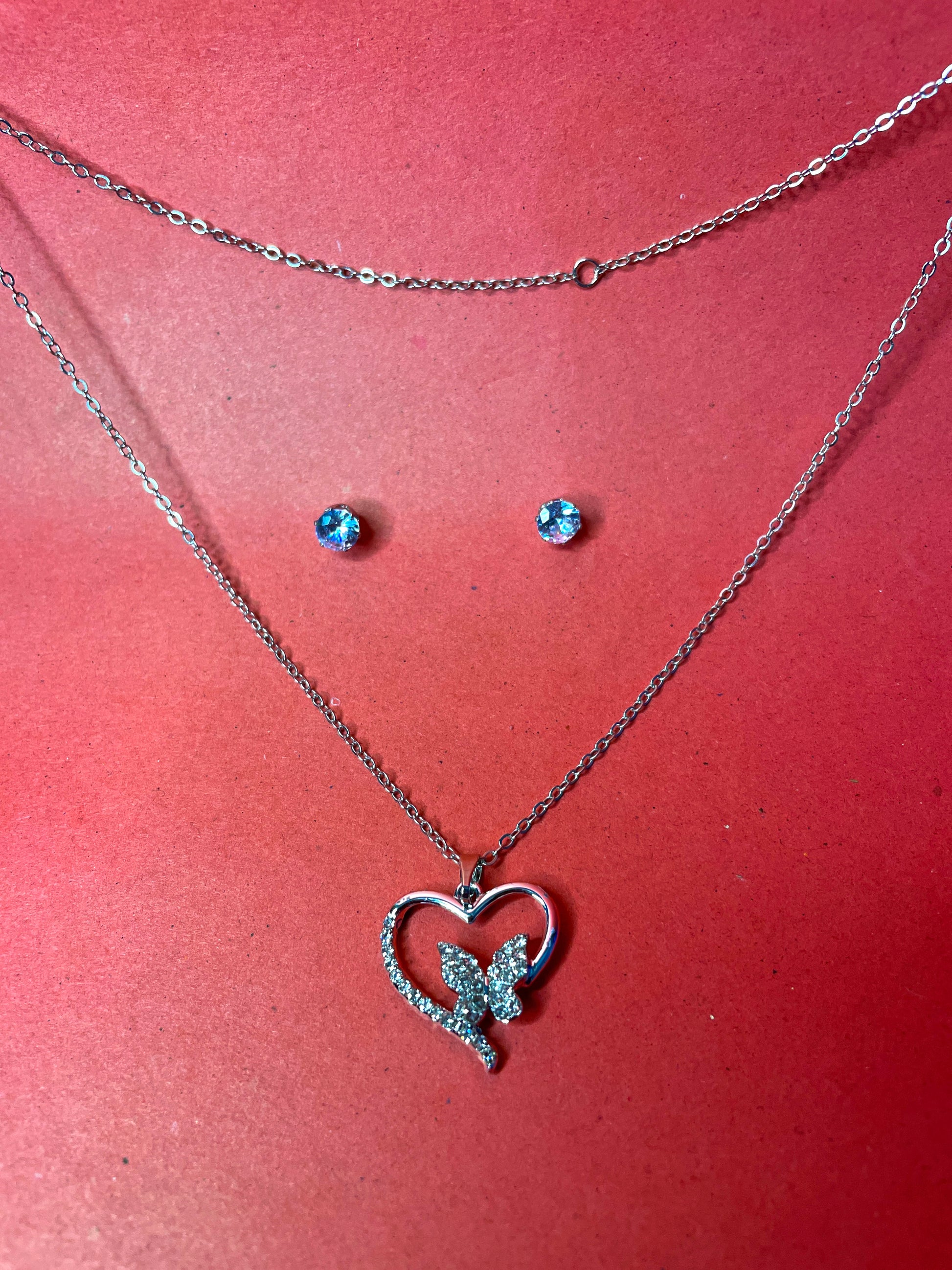 ➌ Pendant Necklace – Heart-shaped pendant with leaf and butterfly, encrusted with clear stones on a sleek silver chain.